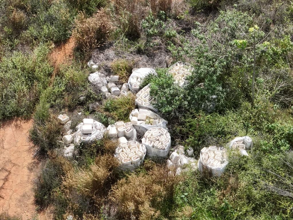 Em continuidade a fiscalização também foram localizados em uma área de conservação e preservação permanente diversos galões vazios de agrotóxico, nas proximidades de uma fonte de água corrente.