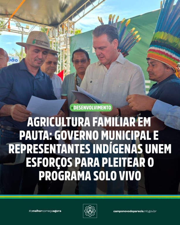 Campo Novo do Parecis segue avançando nas articulações em prol do fortalecimento da agricultura familiar. Com a presença da Diretoria da Associação Waymarê e do conselheiro de Agricultura Familiar do município, senhor Anésio, representante dos agricultores indígenas da região, foi realizada uma importante agenda para pleitear a adesão ao Programa Solo Vivo, do MAPA.