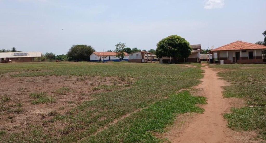 #PraTodosVerem: A imagem mostra a aldeia Pavuru. Há um gramado, que ocupa maior parte da foto, e uma estrada de terra no canto direito. Ao fundo, há construções, com paredes claras, e grandes árvores. É possível observar que o galpão no lado esquerdo possui placas de energia solar. O céu está limpo e azul.