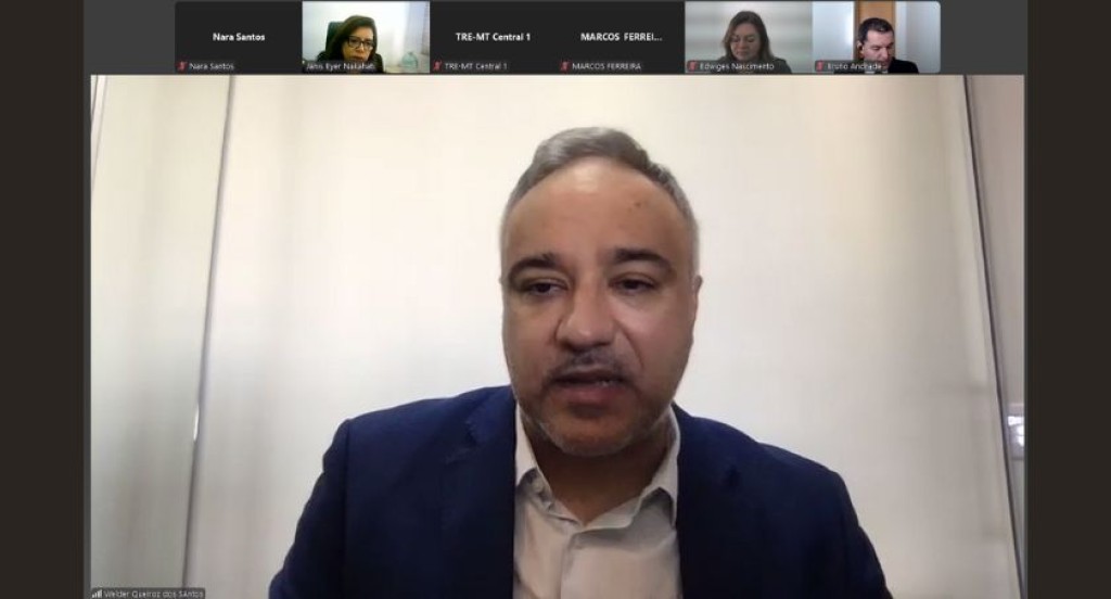 #PraTodosVerem: A imagem mostra uma videoconferência com múltiplos participantes. Em destaque, na parte central da tela, aparece um homem de terno azul escuro e camisa clara, identificado como Welder Queiroz dos Santos, falando. Na parte superior, há miniaturas com outros participantes da reunião, que são outros membros do TRE-MT. Todos estão com os microfones desligados, e o ambiente sugere a realização de um curso virtual.