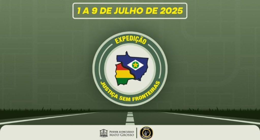 #PraTodosVerem: A imagem anuncia a “Expedição Justiça Sem Fronteiras”, que ocorrerá de 1º a 9 de julho de 2025. No centro, há um selo com os mapas do estado de Mato Grosso e da Bolívia sobrepostos, simbolizando a atuação transfronteiriça. O fundo remete a uma estrada, reforçando a ideia de deslocamento e acesso à justiça em regiões remotas. Na parte inferior, aparecem os logotipos do Poder Judiciário de Mato Grosso e da Justiça Comunitária.