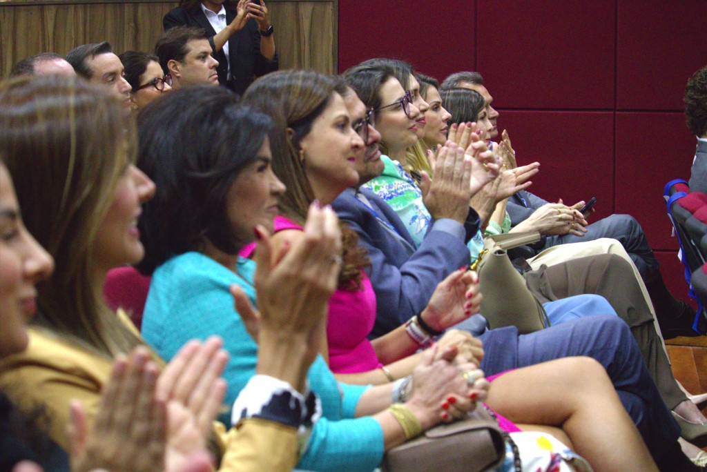 #PraTodosVerem – A imagem mostra um grupo de pessoas, vestindo trajes sociais ou casuais elegantes, sentadas em uma fileira durante um evento, no Plenário do TRE-MT, com painéis vermelhos escuros ao fundo. A maioria dos indivíduos na fileira está aplaudindo, com as mãos levantadas e batendo palmas. O foco principal está nas mulheres da frente, que usam roupas coloridas.
