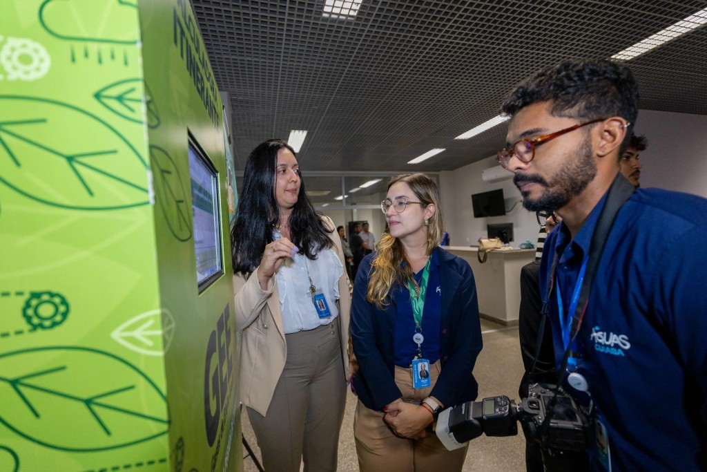 Três pessoas observam um totem verde com ilustrações de folhas e engrenagens. À direita, um homem de barba e óculos segura uma câmera profissional. O ambiente é amplo com teto de grade metálica.Além das 546 audiências de conciliação voltadas à ligação de imóveis residenciais e empresariais à rede coletora de esgoto da capital, a 5ª edição do Mutirão Interligue Já traz ainda mais uma iniciativa voltada à conscientização ambiental: a Calculadora Itinerante de Compensação de Gases de Efeito Estufa, coordenada pelo Núcleo de Sustentabilidade do Tribunal de Justiça de Mato Grosso (TJMT). A ferramenta está disponível durante todo o período do mutirão, até o dia 13 de março, no Centro Judiciário de Solução de Conflitos e Cidadania Ambiental (Cejusc Ambiental), permitindo que os participantes conheçam o impacto ambiental de suas atividades cotidianas e aprendam formas de reduzir ou compensar essas emissões.