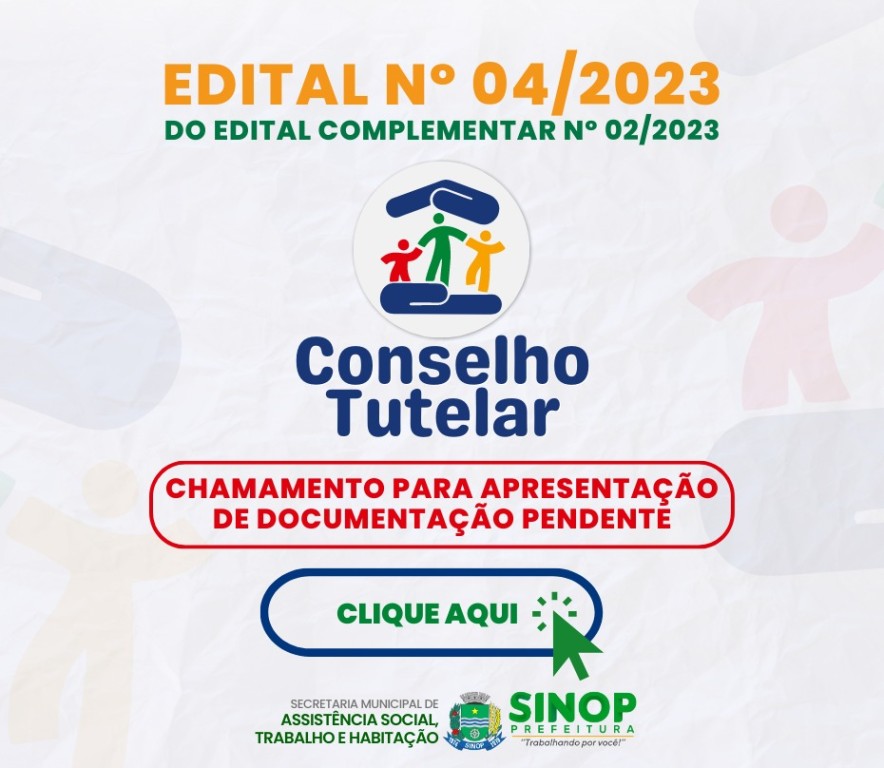 Os candidatos inscritos no processo de escolha de novos conselheiros tutelares de Sinop devem conferir a lista de checagem dos documentos solicitados para inscrição, que está disponível na sede da Secretaria de Assistência Social, Trabalho e Habitação ou através do seguinte link https://www.sinop.mt.gov.br/fotos_downloads/428.pdf. Essa lista contém a relação dos nomes de pessoas inscritas que apresentaram erro no envio de alguma documentação solicitada e precisam reenviar. Neste caso, o candidato poderá entregar os documentos faltantes pessoalmente na Casa dos Conselhos, que fica anexa à Secretaria, localizada na rua das Aroeiras, nº 1.128, Setor Comercial, das 8h às 11h até amanhã, sexta-feira (26).