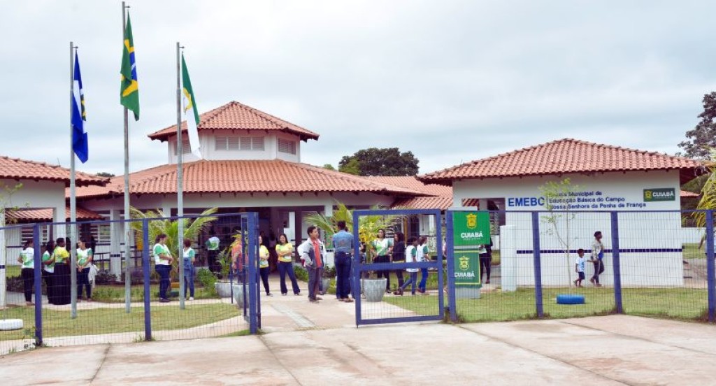 #PraTodosVerem – A imagem mostra a fachada da Escola Municipal de Educação Básica do Campo (EMEBC) “Nossa Senhora da Penha de França”, em Cuiabá. Em frente ao prédio, há pessoas reunidas, algumas entrando e outras circulando pelo pátio. No espaço externo, próximo ao portão de entrada, estão hasteadas bandeiras do Brasil, de Mato Grosso e de Cuiabá. O prédio tem telhado de telhas cerâmicas e paredes claras, transmitindo aspecto organizado e acolhedor.