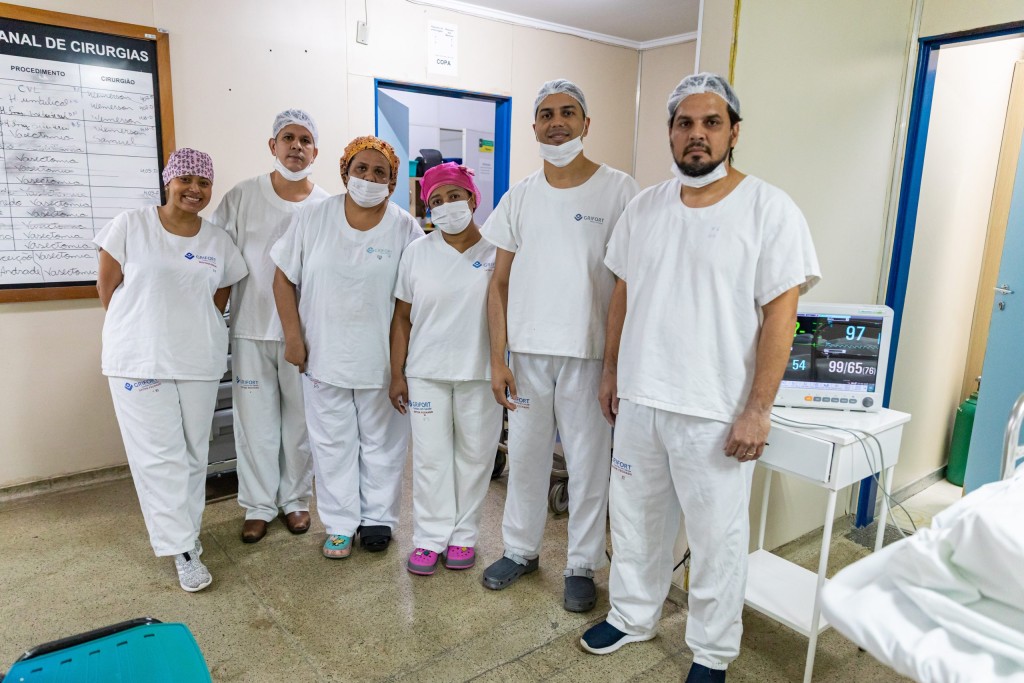 A imagem mostra uma equipe médica posicionada em frente ao centro cirúrgico do Pronto-Socorro de Cuiabá. Todos utilizam roupas adequadas ao ambiente hospitalar, na cor branca.