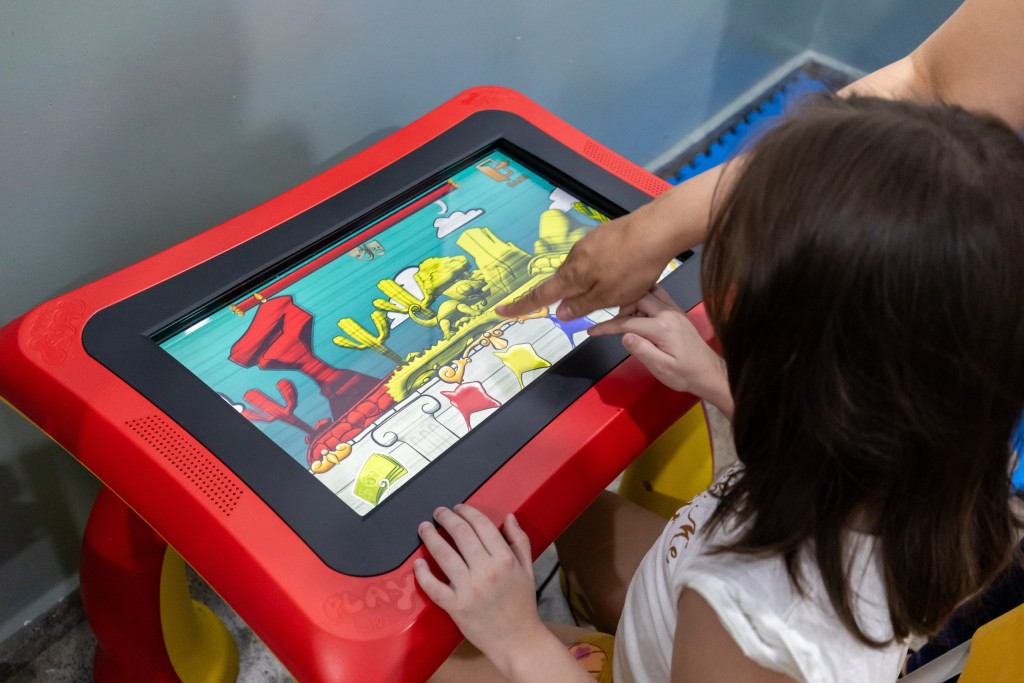 As salas multifuncionais são equipadas com lousa digital, quadro branco, painel sensorial, aramados de percursos e ondulares, massinhas, tatames, letras do alfabeto em formato de madeira e computadores para atividades.