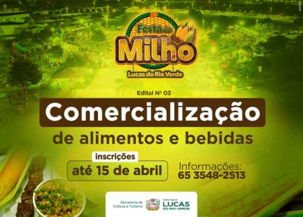 A Prefeitura de Lucas do Rio Verde, por meio da Secretaria de Cultura e Turismo, informa que estão abertas as inscrições para os interessados em participar do Edital de Seleção Nº 003/2026, que trata da exploração comercial de alimentos e bebidas na praça de alimentação da “5ª Festa do Milho, marcada para os dias 09 e 10 de maio de 2026.