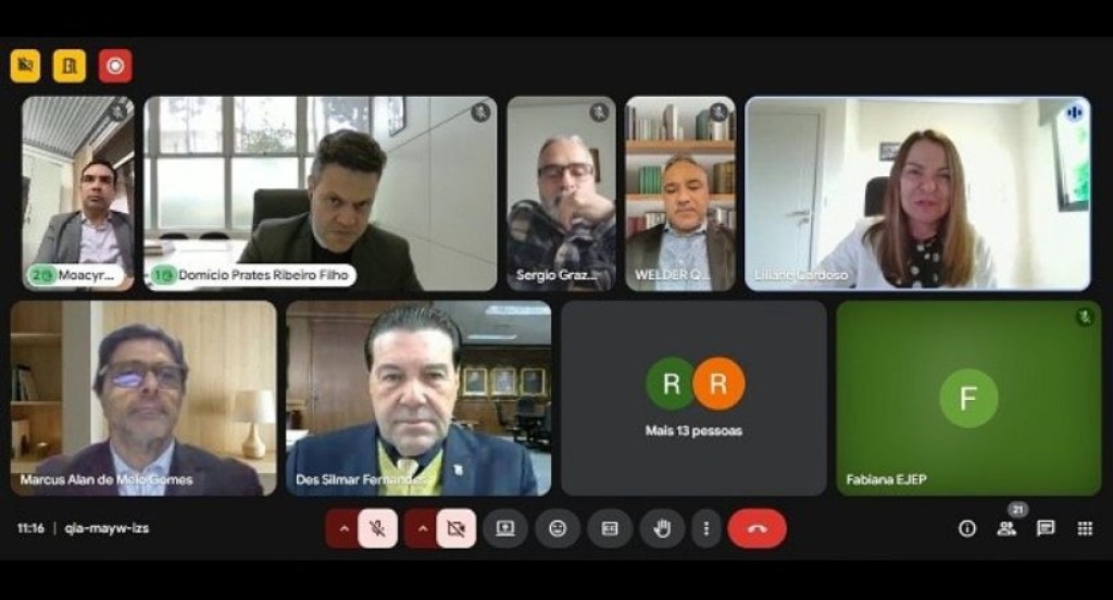 #PraTodosVerem – A imagem mostra uma videoconferência com a participação de várias pessoas, distribuídas em janelas individuais na tela. Ao todo, são exibidos nove participantes com as câmeras ligadas, entre eles homens e uma mulher, todos em ambientes internos, alguns com estantes e outros com paredes neutras ao fundo. A interface utilizada é a do Google Meet, com os botões de controle visíveis na parte inferior.
