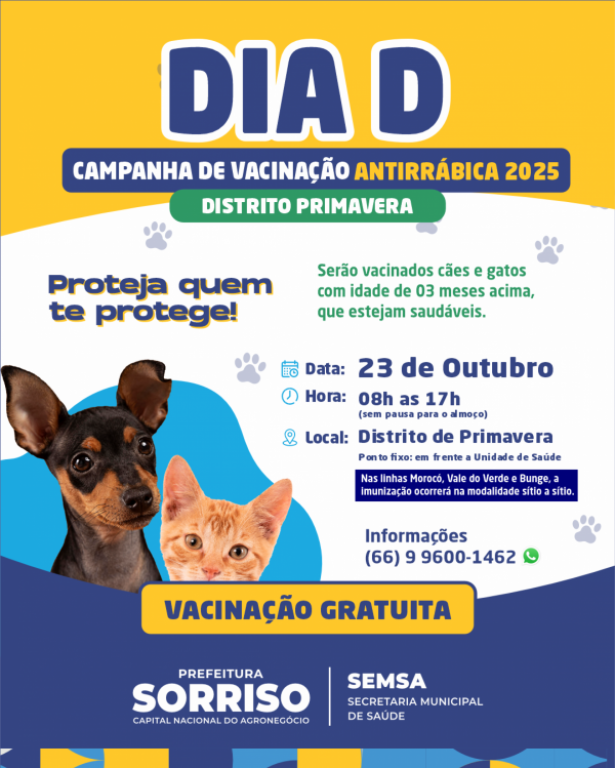 O Distrito de Primavera realizará neste sábado (23), uma ampla mobilização de vacinação contra o vírus da raiva. A iniciativa visa manter a doença, que é fatal em quase 100% dos casos, sob controle na região. A mobilização contará com um ponto de vacinação fixo, estrategicamente localizado em frente à Unidade de Saúde do distrito, que funcionará das 8h às 17h, sem pausa para o almoço, facilitando o acesso para todos os moradores da região.