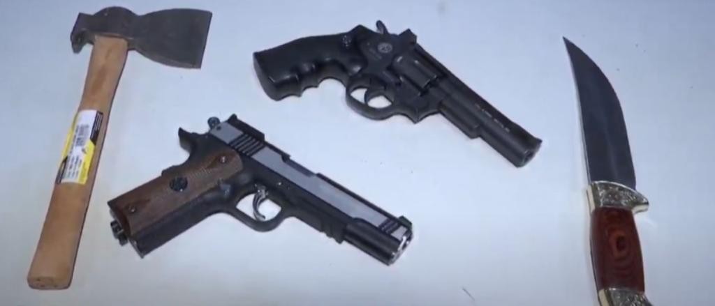 Durante busca veicular, os policiais militares encontraram outro simulacro tipo revólver, uma faca e uma machadinha. Neste momento, as equipes foram informadas por populares de que a dupla teria ameaçado o proprietário de um restaurante na região.