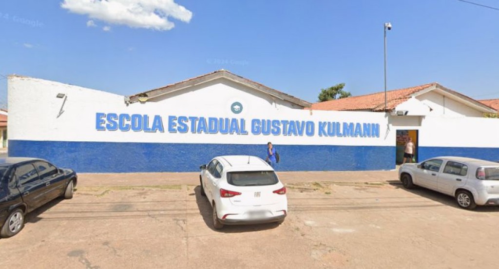 #PraTodosVerem: A imagem mostra a fachada da Escola Estadual Gustavo Kulmann, pintada em branco e azul, com o nome em destaque na parede. Em frente à escola há alguns carros estacionados e duas pessoas próximas ao portão de entrada.