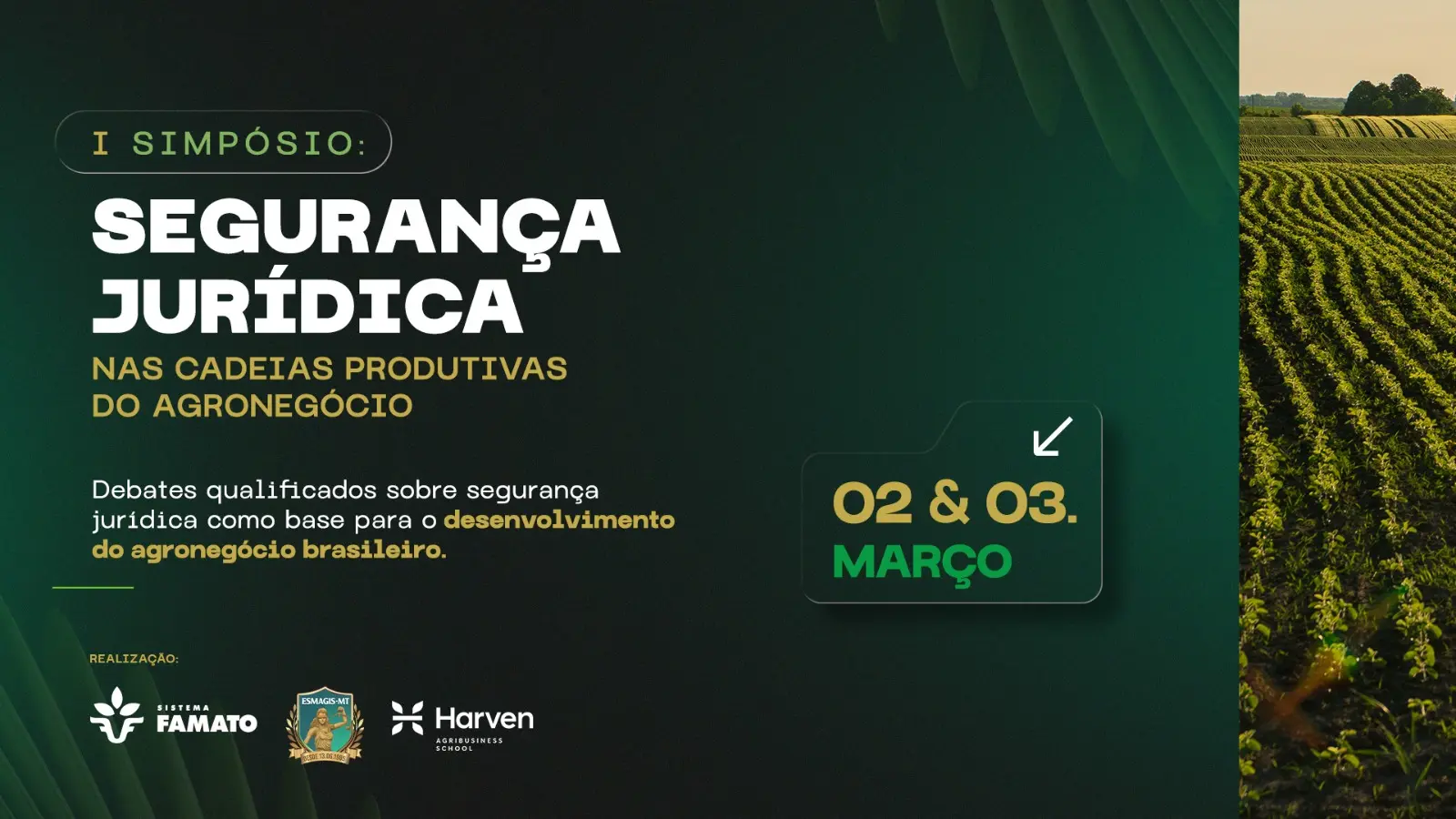 Com o objetivo de promover debate técnico entre o Poder Judiciário de Mato Grosso, setor produtivo rural, advocacia e instituições de ensino, a Escola Superior da Magistratura de Mato Grosso (Esmagis-MT) realiza nos dias 02/03 (das 18h às 21h) e 03/03 (das 8h às 18h) o I Simpósio Segurança Jurídica nas Cadeias Produtivas do Agronegócio. O evento ocorrerá no auditório da Federação da Agricultura e Pecuária de Mato Grosso (Famato), parceira do evento, juntamente com a Harven Agribusiness School.