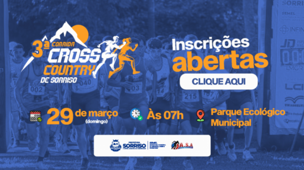 Seguem abertas até o dia 17 de março as inscrições para a 3ª Corrida Cross Country de Sorriso, que será realizada no dia 29 de março, no Parque Ecológico, com percursos de 3 km e 5 km. A competição é promovida pela Prefeitura de Sorriso, por meio da Secretaria Municipal de Esporte, Lazer e Juventude, com apoio da Associação Sorrisense de Atletismo (ASA).