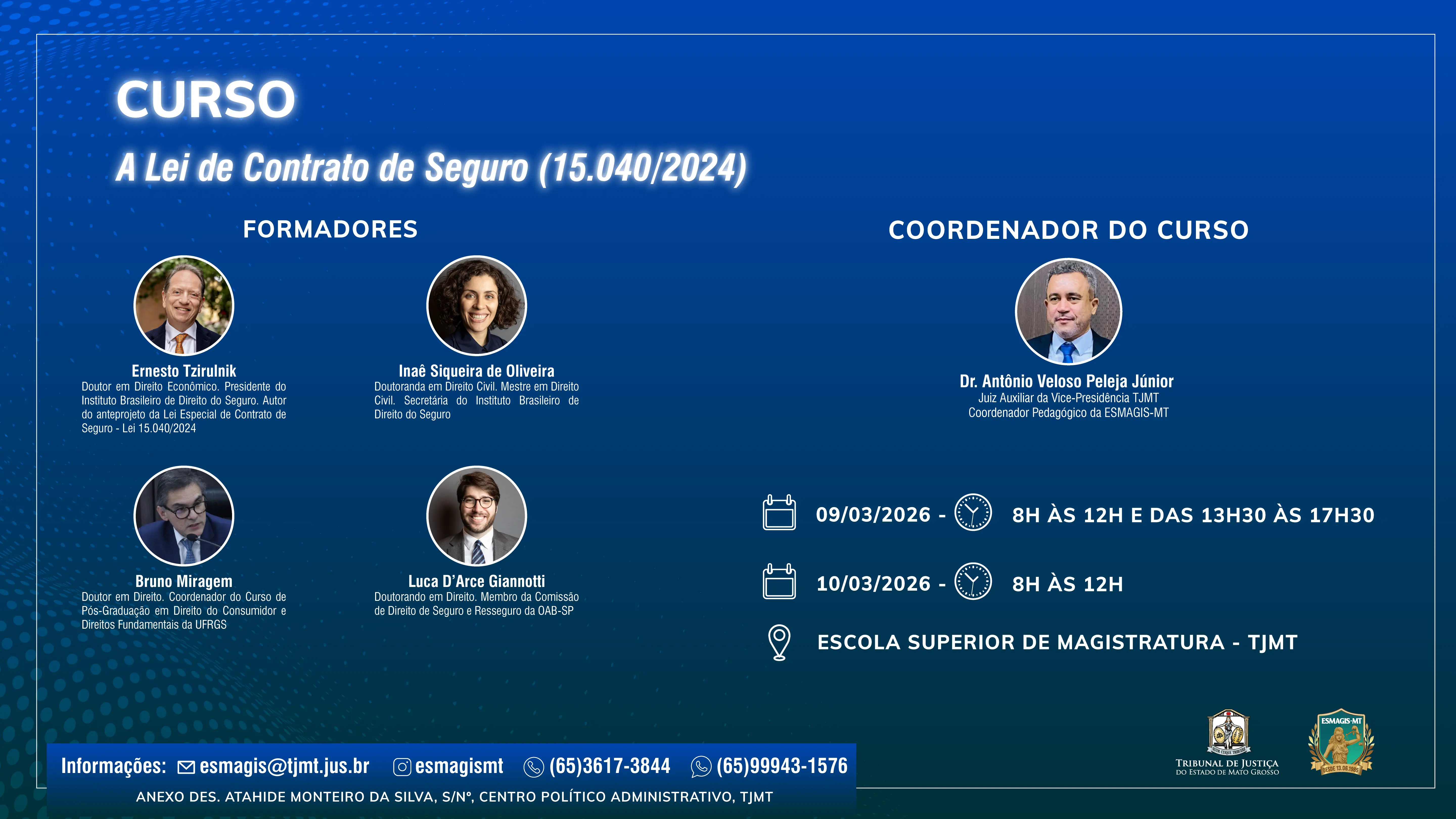 As inscrições para o Curso sobre a Lei de Contrato de Seguro – Lei 15.040/2024, promovido pela Escola Superior da Magistratura de Mato Grosso (Esmagis-MT), terminam amanhã (5 de março), para magistrados(as) e assessores(as) de Cuiabá, Várzea Grande e Santo Antônio de Leverger. A formação é realizada em parceria com o Instituto Brasileiro de Direito do Seguro (IBDS).O curso ocorrerá nos dias 9 e 10 de março, na sede da Esmagis-MT, em Cuiabá. As aulas serão ministradas no dia 9, das 8h às 12h e das 13h30 às 17h30, e no dia 10, das 8h às 12h, totalizando 12 horas-aula, com frequência mínima de 75%. Para magistrados das comarcas do interior, o período de inscrição foi encerrado em 17 de fevereiro.