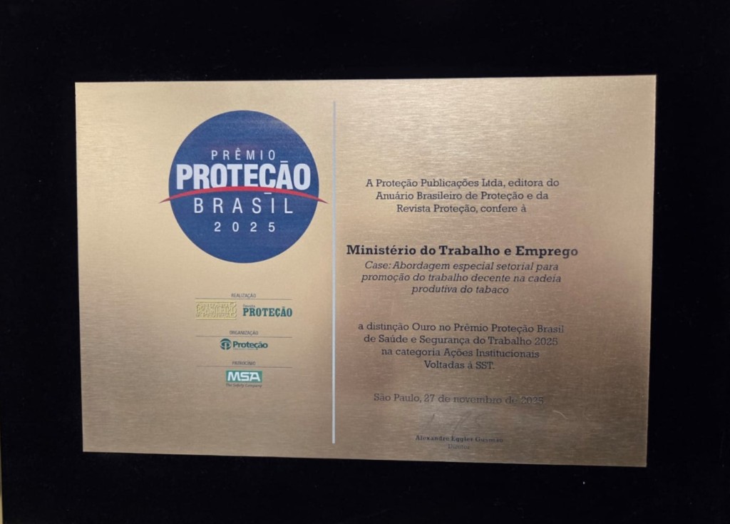 A Inspeção do Trabalho do Ministério do Trabalho e Emprego (MTE) recebeu no encerramento do 8º Congresso Brasileiro de Saúde e Segurança no Trabalho, realizado entre os dias 25 e 27 de novembro em Betim (MG), a distinção Ouro na categoria “Ações Institucionais voltadas à SST” no Prêmio Proteção Brasil 2025, considerado o mais importante reconhecimento nacional voltado à promoção da saúde e segurança no trabalho no país.
