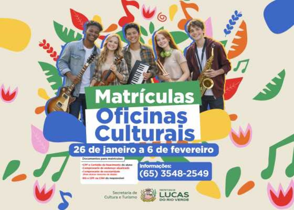 A Prefeitura de Lucas do Rio Verde, por meio da Secretaria de Cultura e Turismo, anuncia a abertura das matrículas para as Oficinas Culturais 2026. A partir do dia 26 de janeiro até 6 de fevereiro, os interessados poderão garantir sua vaga em diversas modalidades artísticas oferecidas pelo município.