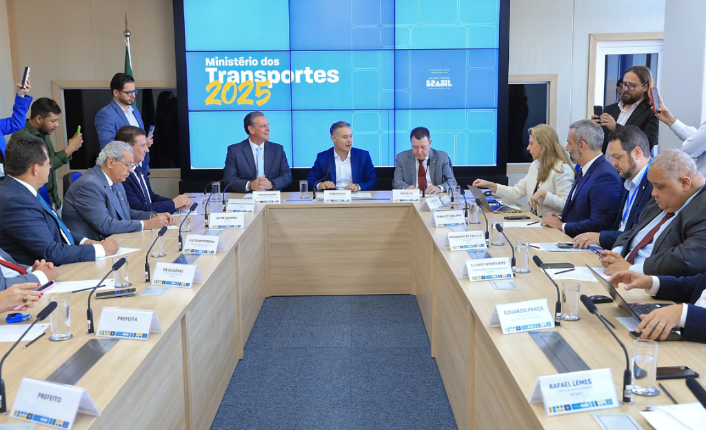 Nesta terça-feira (17), o ministro da Agricultura e Pecuária, Carlos Fávaro, participou de reunião na sede do Ministério dos Transportes, em Brasília, ao lado do ministro Renan Filho. O encontro teve como foco o andamento de obras logísticas prioritárias para os estados de Mato Grosso e Goiás, entre elas a conclusão da obra na Ponte de Luís Alves, na BR-080/GO/MT, e a pavimentação de trechos da BR-158/MT.