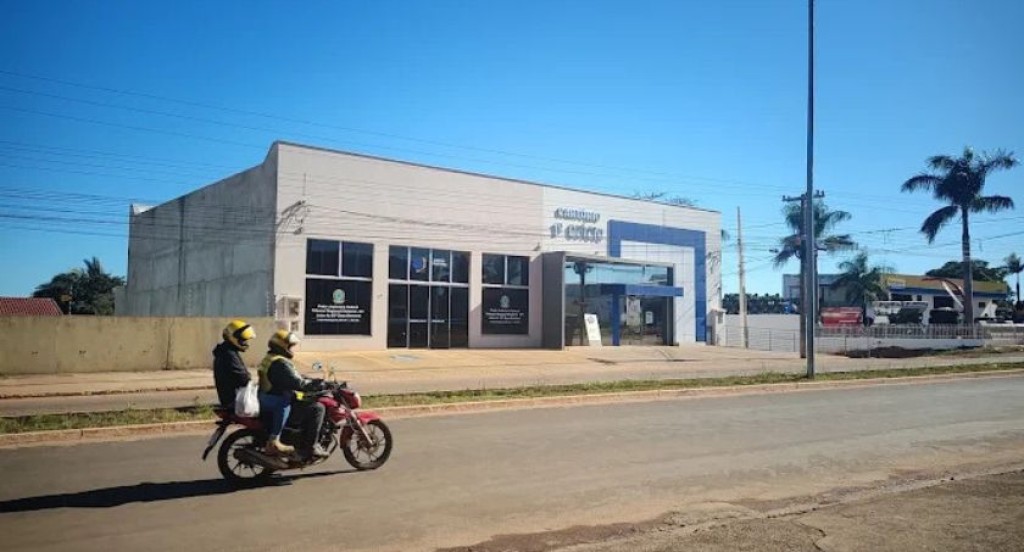 #PraTodosLerem – A imagem mostra, sob um céu azul e em um dia ensolarado, o prédio térreo do Cartório Eleitoral da 25ª Zona Eleitoral de Pontes e Lacerda. A edificação moderna possui fachada nas cores branco e cinza, com detalhes em azul e amplas janelas escuras. Em primeiro plano, uma motocicleta vermelha com dois ocupantes, ambos usando capacetes amarelos, passa pela rua asfaltada em frente ao prédio.