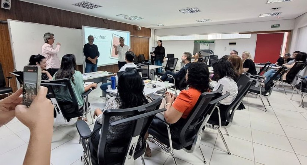 #PraTodosVerem: A imagem mostra uma sala de reuniões com várias pessoas participando de uma apresentação. Algumas estão sentadas em cadeiras giratórias, organizadas em fileiras, enquanto outras estão em pé na frente da sala, próximas a uma tela de projeção que exibe a palavra “senhor” como parte de uma apresentação. O ambiente é moderno, com iluminação clara, paredes brancas e revestimento de madeira ao fundo. Uma pessoa na frente segura um microfone, enquanto outra tira fotos ou grava com um celular, indicando um momento de destaque no evento.