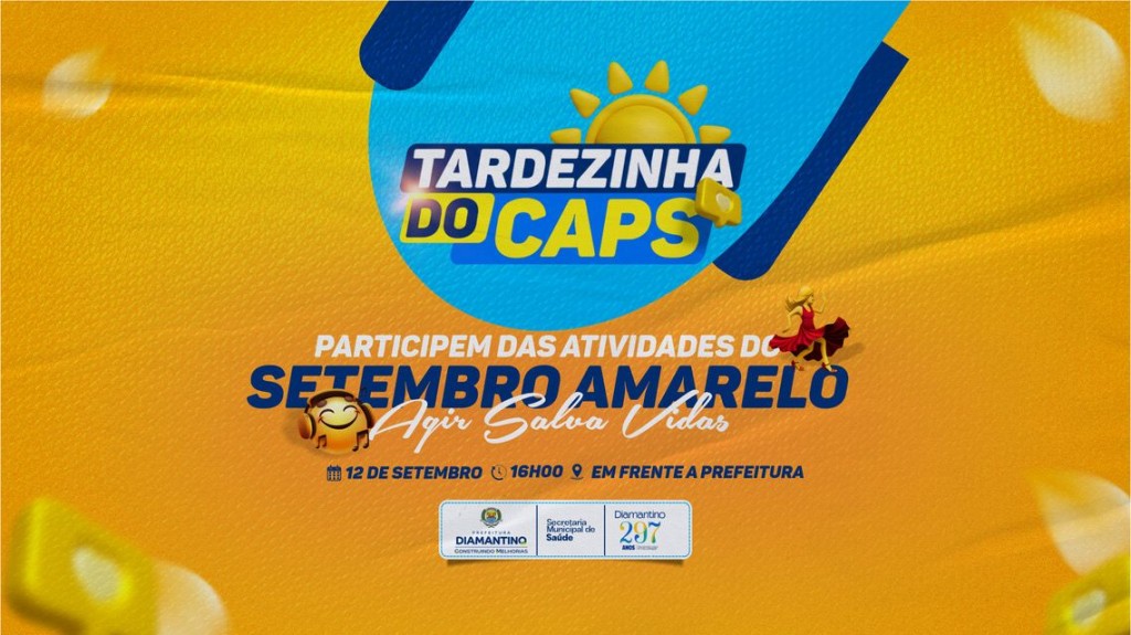 No dia 12 de setembro (sexta-feira), às 16h, a Prefeitura de Diamantino, por meio da Secretaria Municipal de Saúde e através do Centro de Atenção Psicossocial (CAPS), convida toda a comunidade para participar da primeira edição da “Tardezinha do CAPS”. O evento, em alusão à campanha Setembro Amarelo, será realizado na Praça Benedito Bruno, em frente à Prefeitura Municipal.