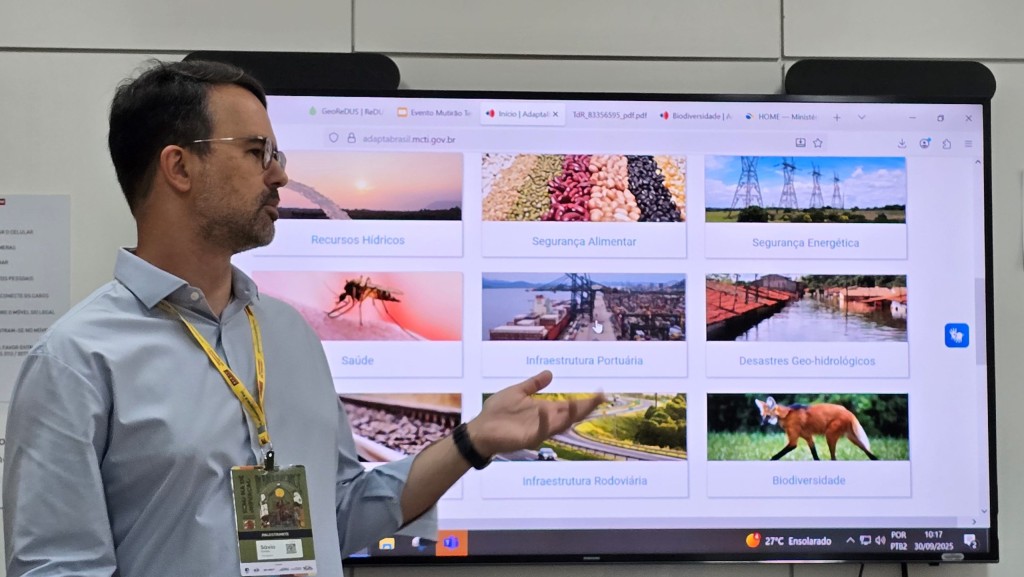 O supervisor da componente de Impactos, Vulnerabilidade e Adaptação do projeto Ciência&Clima e integrante da Coordenação-Geral de Ciência do Clima do Ministério da Ciência, Tecnologia e Inovação (MCTI), Sávio Raeder, apresentou os principais aspectos da plataforma AdaptaBrasil, destacando a metodologia utilizada para avaliar o risco climático, que considera as ameaças climáticas, a vulnerabilidade (incluindo sensibilidade e capacidade adaptativa) e a exposição.