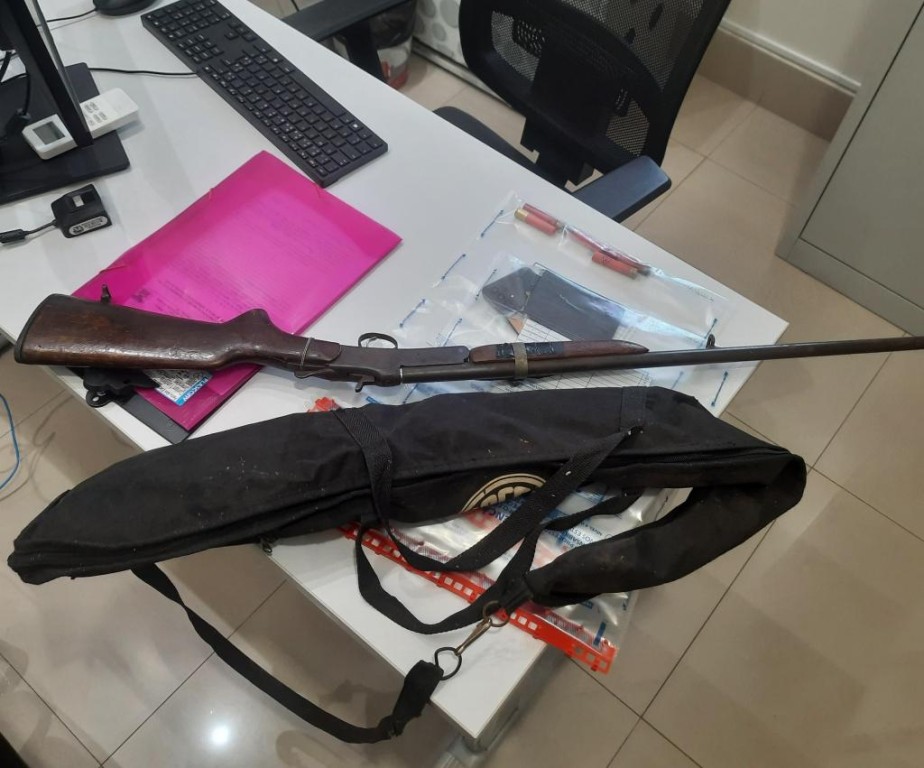 Durante cumprimento das buscas, os policiais encontraram na residência uma espingarda calibre 36, sem numeração visível e munições, que estavam escondidas dentro de um saco de ração. No momento em que a equipe policial estava na casa, o suspeito ainda quebrou o aparelho celular, possivelmente na tentativa de apagar outras provas em seu desfavor.