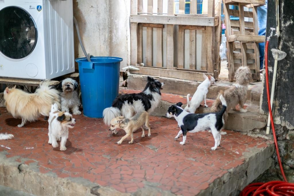 As equipes chegaram à casa após denúncias e foram recepcionadas pela proprietária, de 58 anos. Ao entrar na residência, os policiais e servidores encontraram muitos cachorros e um ambiente degradante, com muita sujeira e em total falta de controle.