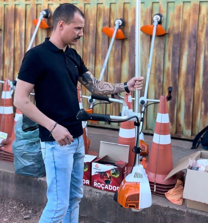 Entre os itens entregues estão kits de roçadeiras, suportes para roçadeiras, jogos de proteção, botinas, óculos, luvas, chapéus e cones para sinalização.