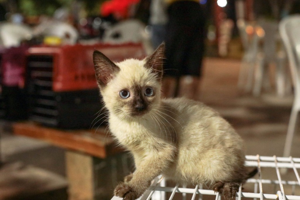 A imagem mostra um filhote de gato em cima de uma gaiola. O animal é cinza, com coloração mais escura nas patas, orelhas e focinho.