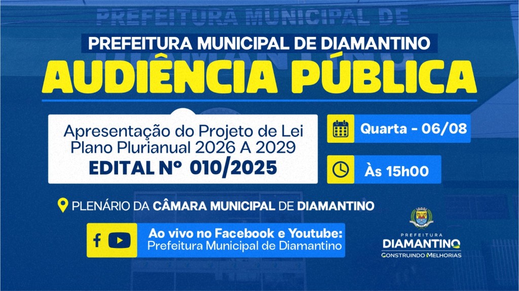 A Prefeitura Municipal de Diamantino, por meio da Secretaria Municipal de Fazenda, convida toda a população e as entidades representativas do município para participarem da Audiência Pública que tratará da elaboração e discussão do Plano Plurianual (PPA) 2026–2029, conforme o edital 010/2025.