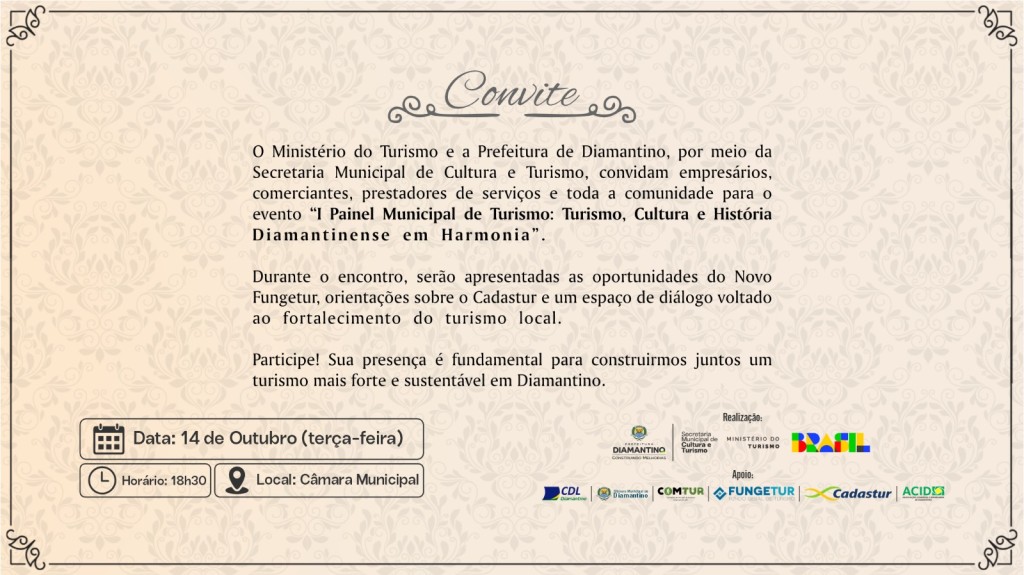 A Prefeitura de Diamantino, por meio da Secretaria Municipal de Cultura e Turismo, em parceria com o Ministério do Turismo convidam toda a comunidade, empresários do setor turístico, comerciantes, prestadores de serviços e demais interessados para participarem do I Painel Municipal de Turismo, com o tema “Turismo, Cultura e História Diamantinense em Harmonia”.
