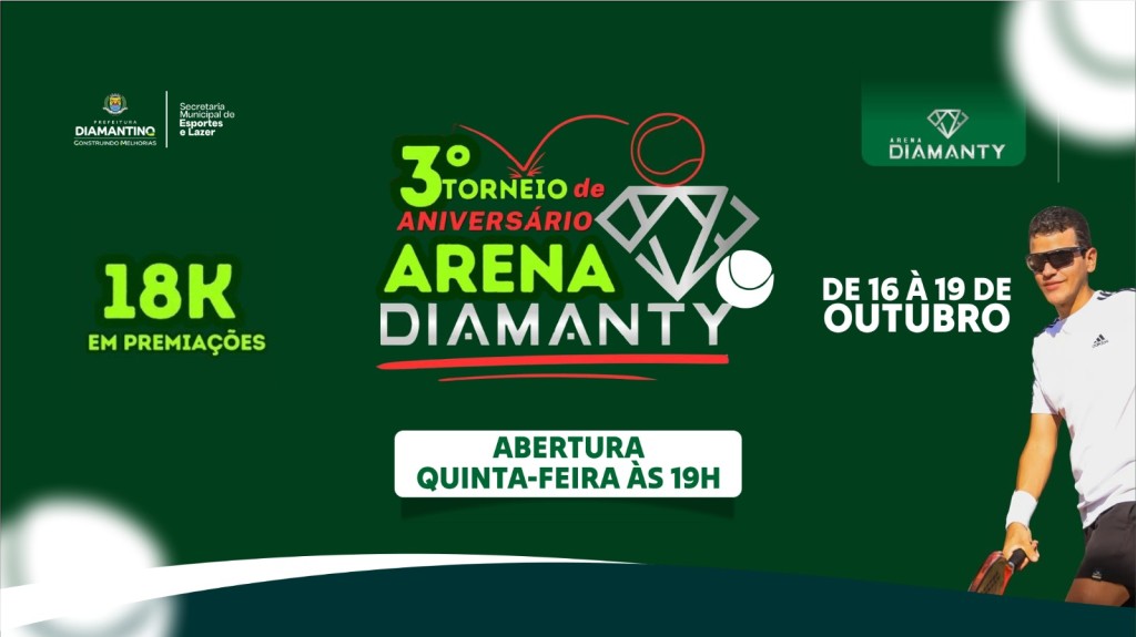 A fim de fortalecer ainda mais o incentivo à prática esportiva, entre os dias 16 e 19 de outubro será realizado o 3º Campeonato de Beach Tennis da Arena Diamanty, que nesta edição conta com o apoio da Prefeitura de Diamantino e do comércio local. A competição reunirá centenas de atletas de toda a região e oferecerá uma premiação total de R$18 mil.