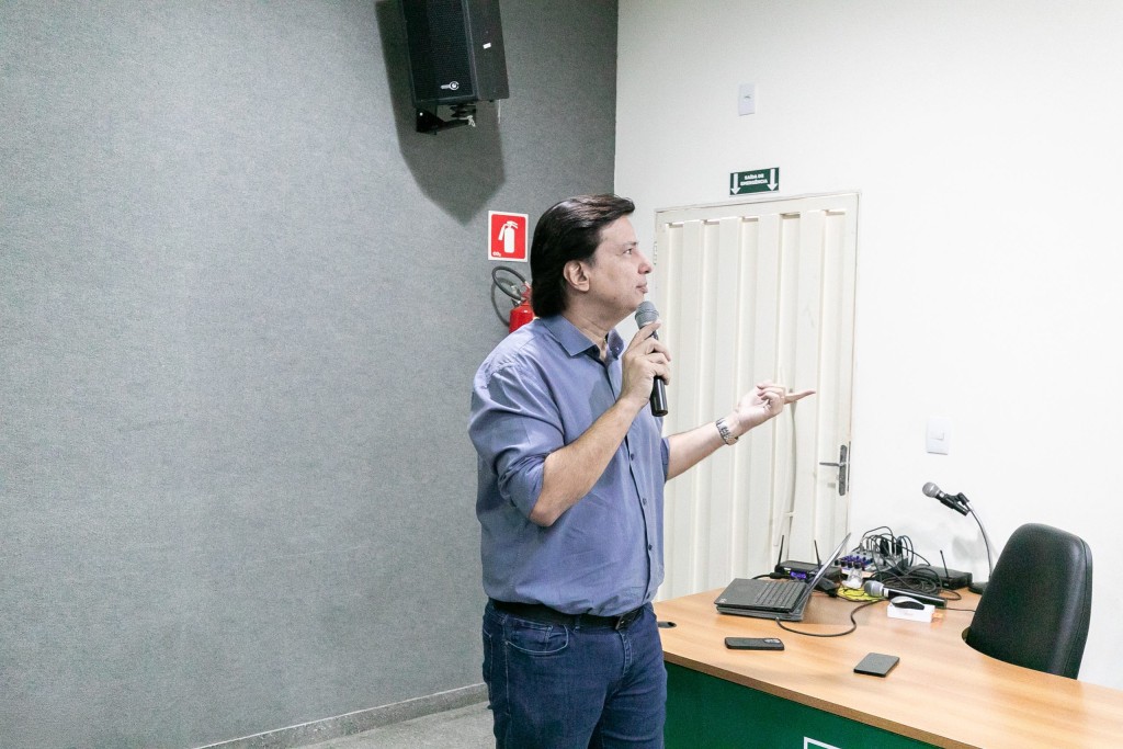 A foto ilustra o presidente do Cuiabá Prev, Fernando Jorge Mendes de Oliveira, vestido de traje social, com um microfone na mão, olhando em direção a uma tela.