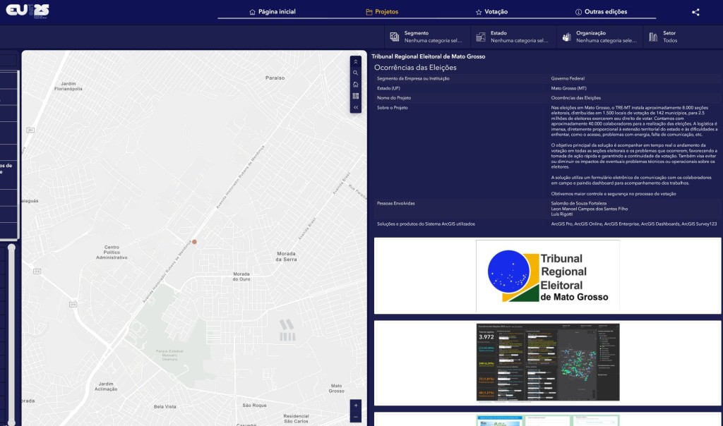 O Tribunal Regional Eleitoral de Mato Grosso (TRE-MT) foi indicado ao EU Esri Brasil 2025, premiação nacional que reconhece iniciativas inovadoras no uso da inteligência geográfica. O projeto selecionado, intitulado “Ocorrências das Eleições”, foi desenvolvido para garantir maior eficiência, agilidade e segurança no processo eleitoral em Mato Grosso. A votação segue até o dia 06 de outubro (link no final do texto).