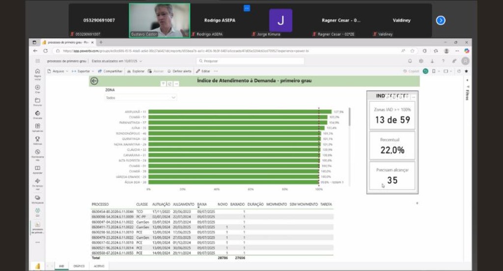 #PraTodosVerem: A imagem mostra uma videoconferência em andamento, com destaque para a apresentação de Gustavo Castro, Assessor de Metas. A tela compartilhada exibe um painel do Power BI sobre o Índice de Atendimento à Demanda (IAD) no primeiro grau, com gráficos de barras que indicam o desempenho de diferentes zonas eleitorais. A parte inferior da tela apresenta uma tabela com dados detalhados de processos. A reunião envolve servidores da Justiça Eleitoral.