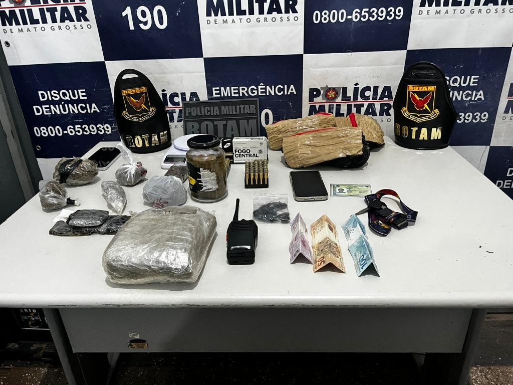 Policiais militares do Batalhão de Rondas Ostensivas Tático Móvel (Rotam) prenderam um homem, de 23 anos, por tráfico ilícito de drogas, na noite desta quarta-feira (26.11), em Cáceres. Com o suspeito, foram apreendidas porções de maconha e diversos tamanhos e 68 munições.