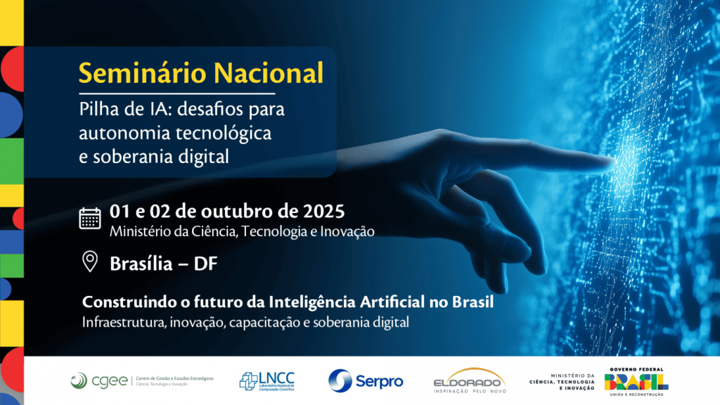 O Ministério da Ciência, Tecnologia e Inovação (MCTI) promove, em 1º e 2 de outubro, em Brasília (DF), o seminário  Pilha de IA Nacional: Desafios para Autonomia Tecnológica e Soberania DigitalO evento será gratuito e presencial, na sede do Serviço Federal de Processamento de Dados (Serpro), com transmissão on-line.