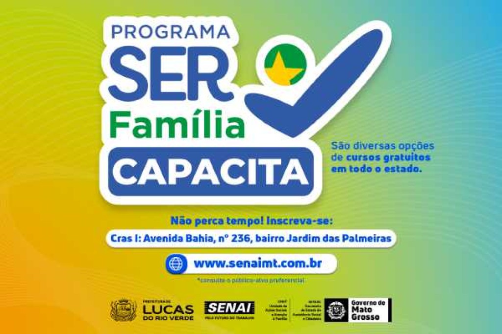 A Secretaria de Assistência Social e Habitação de Lucas do Rio Verde informa que estão abertas as inscrições para os cursos gratuitos de Assistente Administrativo, Assistente Contábil Financeiro e Instalador e Reparador de Redes de Computadores, oferecidos pelo programa Ser Família Capacita.