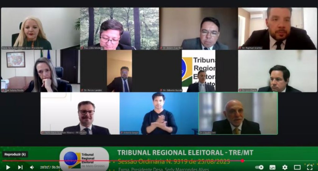 #PraTodosVerem: A imagem mostra uma sessão virtual do TRE-MT, realizada por videoconferência. Nela, vários magistrados, servidores e participantes aparecem em suas respectivas telas, incluindo a presidente da sessão, destacada na parte superior esquerda. Na parte inferior, há também a presença de um intérprete de Libras, garantindo acessibilidade à transmissão. Na faixa inferior da tela, consta a identificação do evento: Sessão Ordinária nº 9319, de 25/08/2025, presidida pela desembargadora Serly Marcondes Alves.