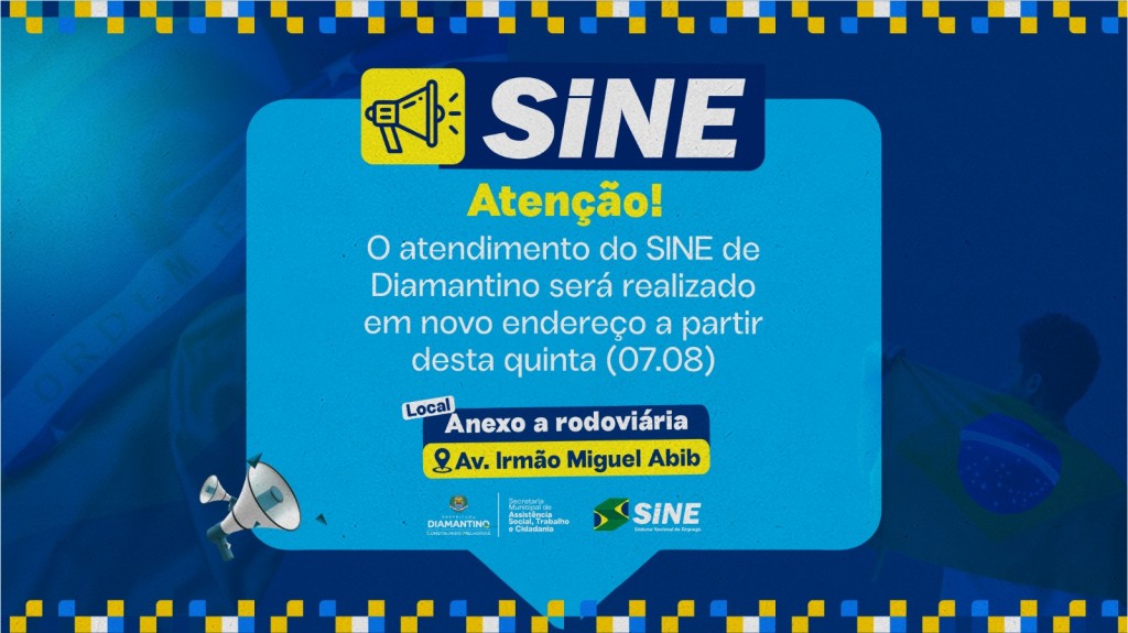 A Prefeitura de Diamantino, por meio da Secretaria Municipal de Assistência Social, Trabalho e Cidadania, informa à comunidade que o Sistema Nacional de Emprego (SINE) de Diamantino passará a atender em novo endereço.
