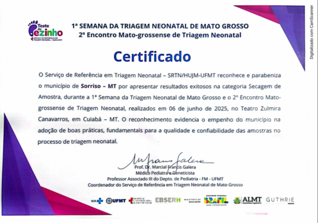 Sorriso foi homenageado durante a 1ª Semana da Triagem Neonatal de Mato Grosso e o 2º Encontro Mato-grossense de Triagem Neonatal, realizados no último dia 6 de junho, no auditório da Sede das Promotorias de Justiça, em Cuiabá. O Município recebeu um certificado de destaque na categoria Secagem de Amostra, atestando o compromisso da equipe local com a qualidade e a confiabilidade do processo de triagem neonatal.