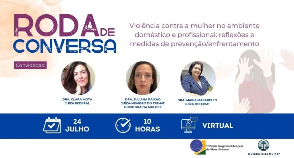 #DescriçãodaImagem: Imagem promocional do evento “Roda de Conversa” com o tema: Violência contra a mulher no ambiente doméstico e profissional: reflexões e medidas de prevenção/enfrentamento. Participam como convidadas as juízas Clara Mota (federal), Juliana Paixão (TRE-MT) e Maria Mazarello (TJ-MT). O evento será virtual, no dia 24 de julho, às 10h. A arte tem fundo claro com tons de rosa e azul, e traz ícones de calendário, relógio e transmissão online, além das logomarcas do TRE-MT e da Ouvidoria da Mulher.