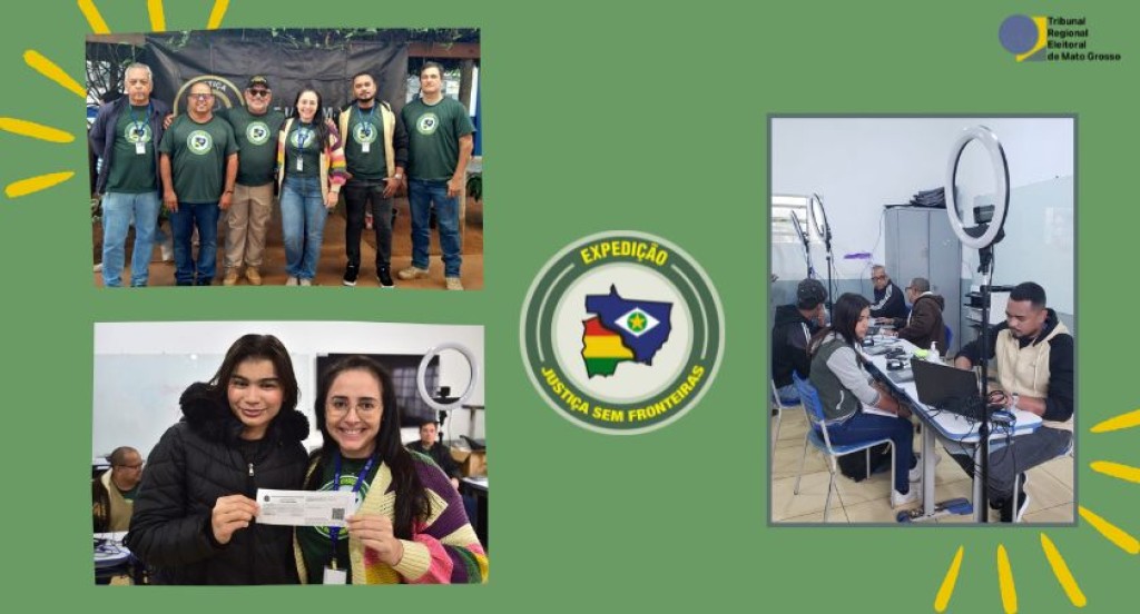 #PraTodosVerem: A imagem mostra uma arte institucional do TRE-MT, destacando a Expedição Justiça sem Fronteiras. No centro está o logotipo do projeto, com o mapa do estado e as cores da bandeira do Brasil. No canto superior esquerdo, há uma equipe de servidores uniformizados posando para foto. Abaixo, uma jovem eleitora segura o título eleitoral ao lado de uma servidora sorridente. À direita, outra imagem mostra o atendimento eleitoral sendo realizado em uma sala, com equipamentos de biometria e iluminação. O fundo verde e elementos gráficos dão um tom acolhedor e informativo à composição.