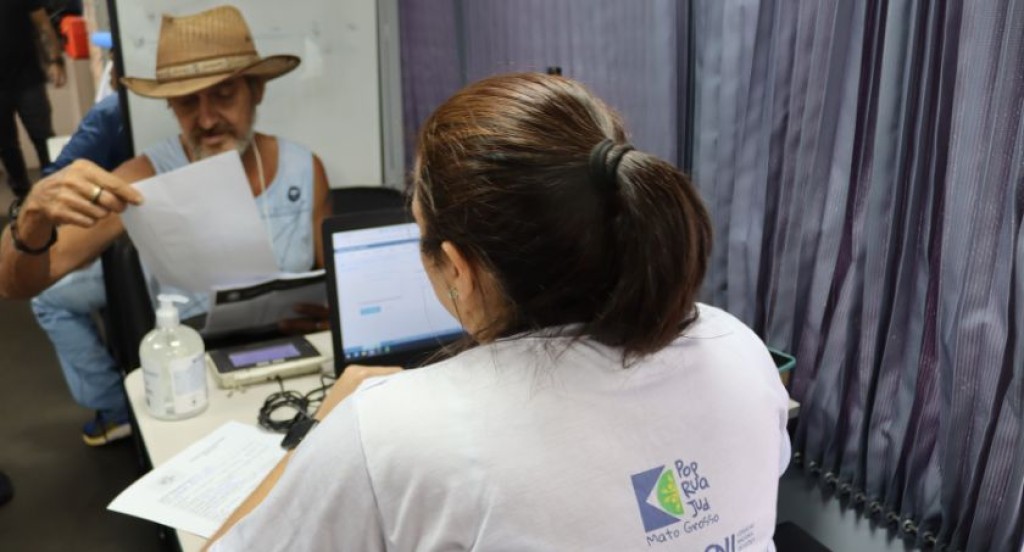 #PraTodosVerem: A imagem mostra um atendimento no ônibus da Justiça Eleitoral Móvel. Em primeiro plano, uma mulher de cabelo preso, vestindo camiseta branca com o logotipo do projeto “Pop Rua Jud Mato Grosso”, opera um computador enquanto atende um homem de chapéu e colete jeans, que segura um documento nas mãos. Sobre a mesa há papéis, álcool em gel e equipamentos de informática, compondo um cenário de prestação de serviços à população.